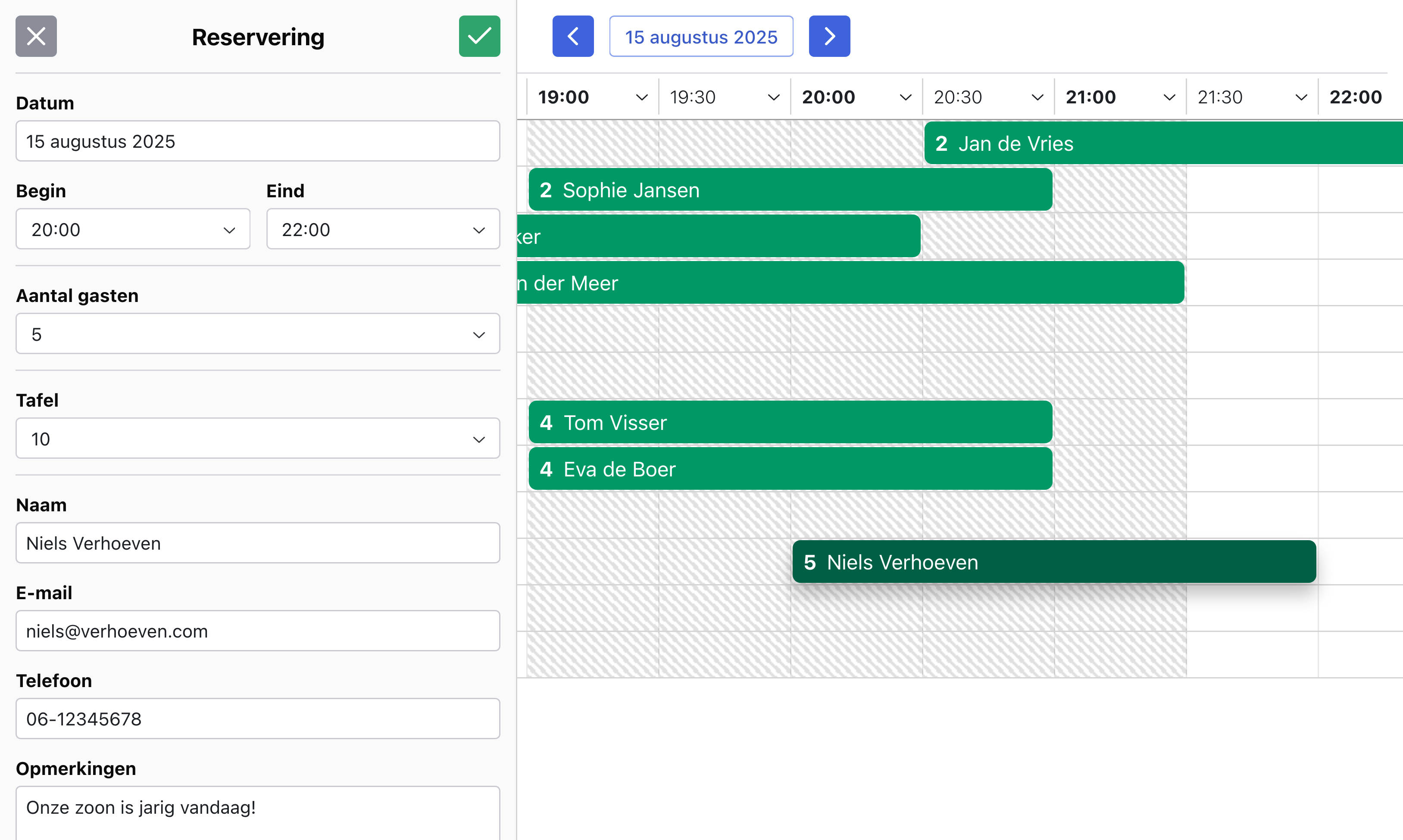 Met Tapla beheer je moeiteloos reserveringen voor een vaste lage prijs van €29 per maand. Zorg er vandaag nog voor dat jouw gasten online een tafel kunnen reserveren!
